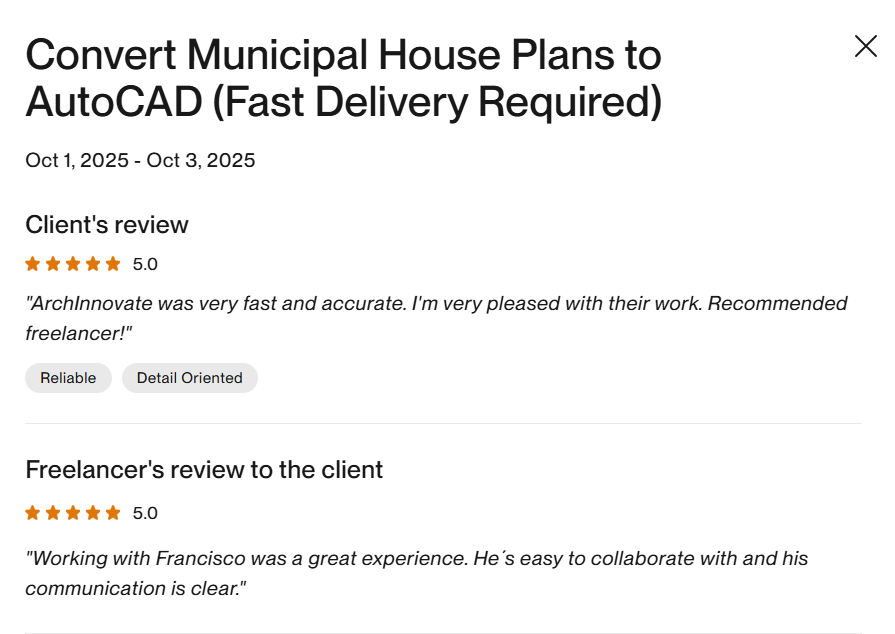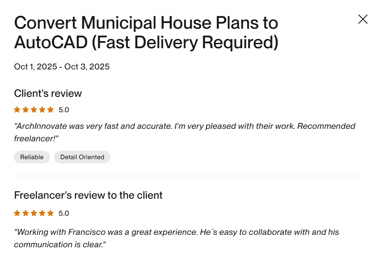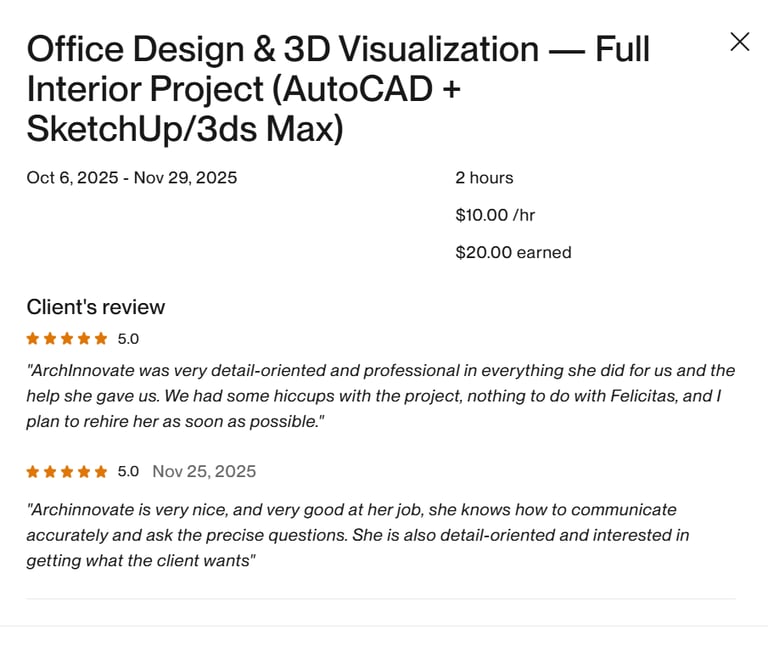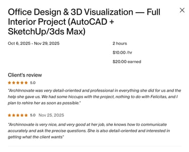 With a strong portfolio of successfully executed projects, Archinnovate is building reputation through the Upwork platform, ensuring transparency, efficiency, and complete client confidence. Each project is handled with a commitment to quality, punctuality, and clear communication, supported by Upwork’s secure and reliable work environment.